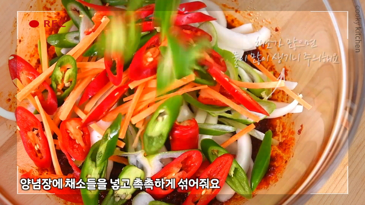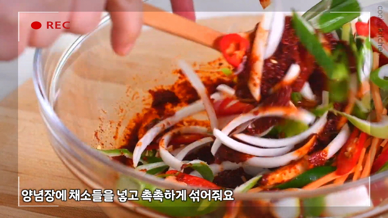 만들어둔 양념장에 손질한 채소를 넣고 골고루 버무려준다. 채소가 너무 많으면 양념에 물이 생길 수 있으니, 적당한 양을 넣도록 하자.