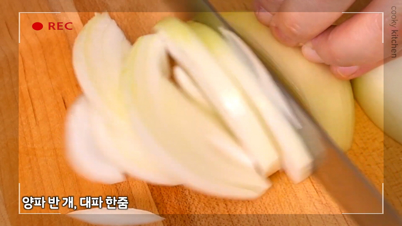 먼저 양파 반 개와 대파 한 줌을 잘게 썰어주자. 냉동 꽃게의 잡내를 잡아주고, 적당한 단맛도 더해준다.
