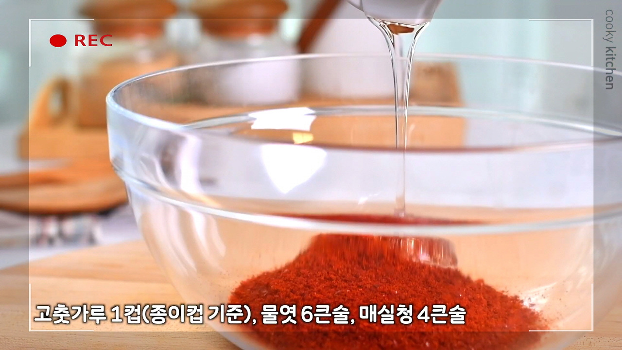 먼저 고춧가루 1컵(종이컵 기준), 물엿 6큰술, 매실청 4큰술, 맛술 4큰술, 간장 6큰술, 참기름 2큰술을 넣어준다.