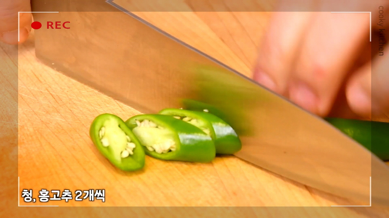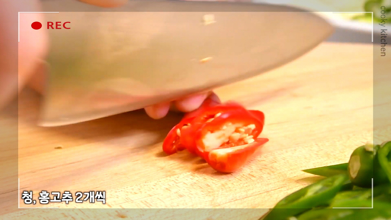 청고추와 홍고추를 2개씩 썰어주자. 홍고추가 없으면 청고추 4개로 대신해도 괜찮다. 양념게장에 매콤함과 알싸한 향을 더해주는 야채다.