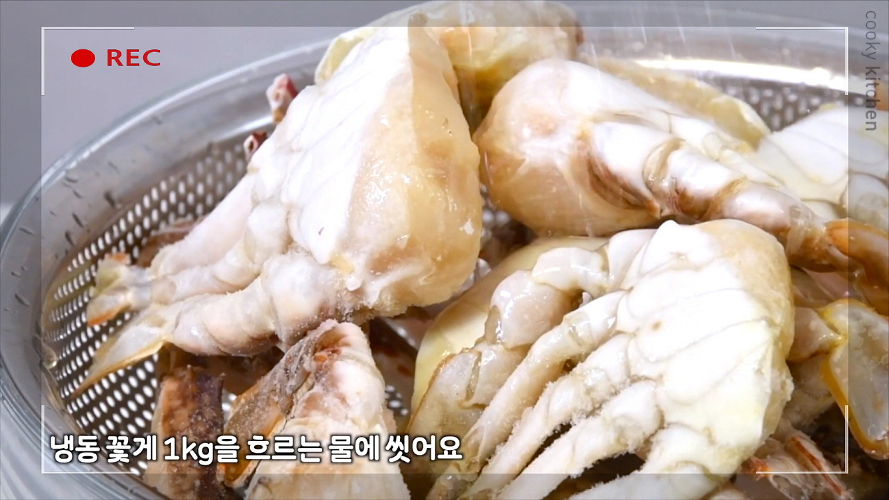 사진에 보이는 것처럼 냉동 꽃게 1kg을 흐르는 물에 깨끗하게 씻어준다.