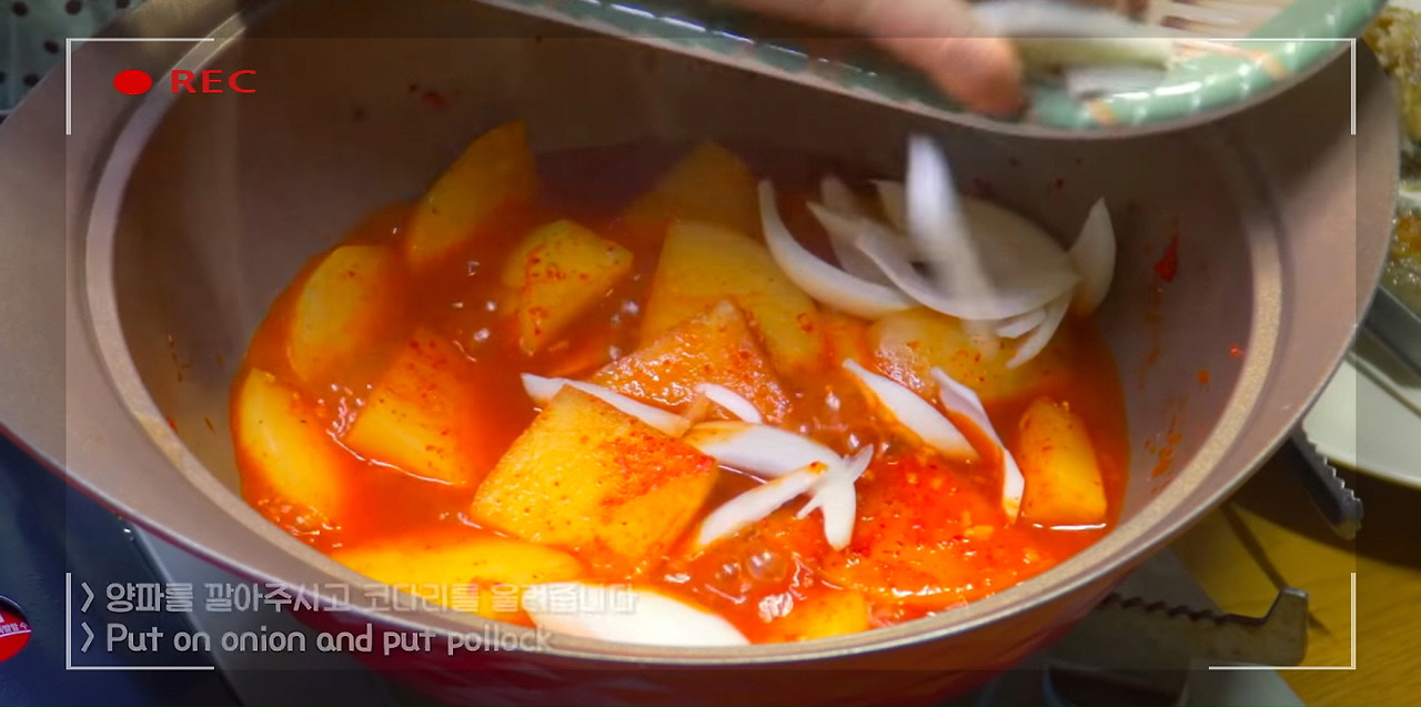 깔아둔 양파 위에 노릇하게 구워진 코다리를 올리고, 아까 만들어 둔 나머지 양념장도 모두 올려준다.
