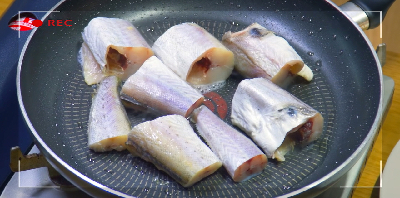 우선, 기름을 충분히 두른 팬에 코다리를 올려주자. 이때 코다리에 남아 있는 물기는 꼭 제거해주자.