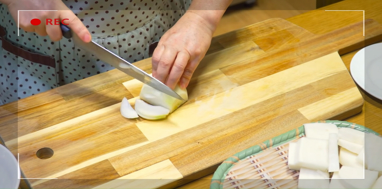 양파는 슬라이스로 반으로 썰어주자. 코다리조림에 은은한 단맛과 깔끔한 맛을 더해준다.