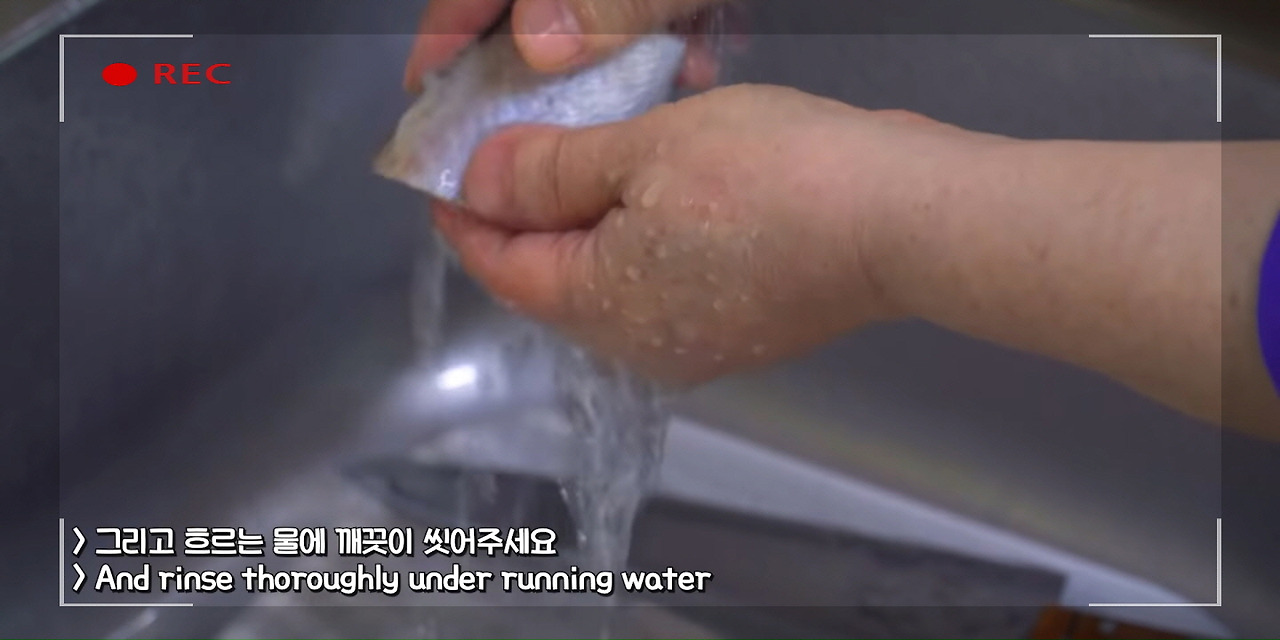 칼질을 마친 코다리를 흐르는 물에 깨끗이 씻어 주자. 남아 있는 이물질을 제거해 더욱 깔끔한 코다리조림이 완성된다.