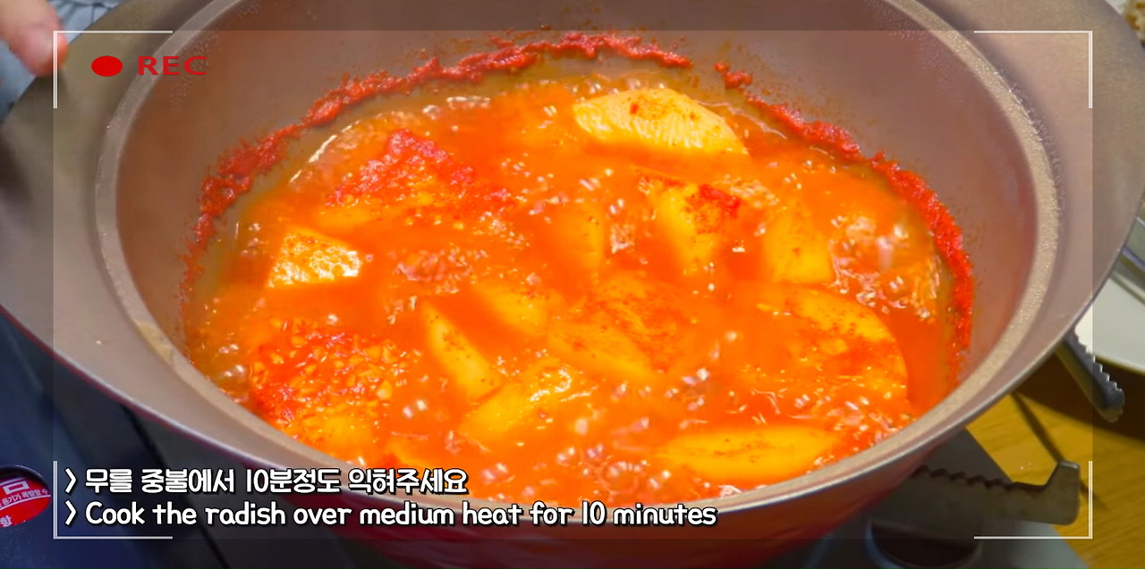중불에서 무를 10분 정도 익히면 이렇게 무가 살짝 익어 간이 배인다.