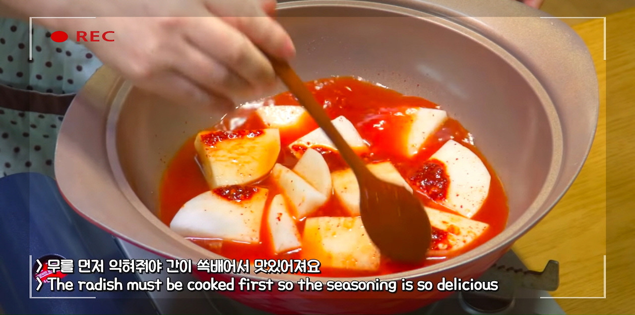 이렇게 무와 양념을 넣고 한 번 익혀주자. 코다리조림을 하기 전에 무를 먼저 익히면 무에 간이 더 잘 배어 맛이 깊어진다. 몇몇 사람들은 이렇게 푹 익은 무를 먹으려고 코다리찜을 하기도 한다.