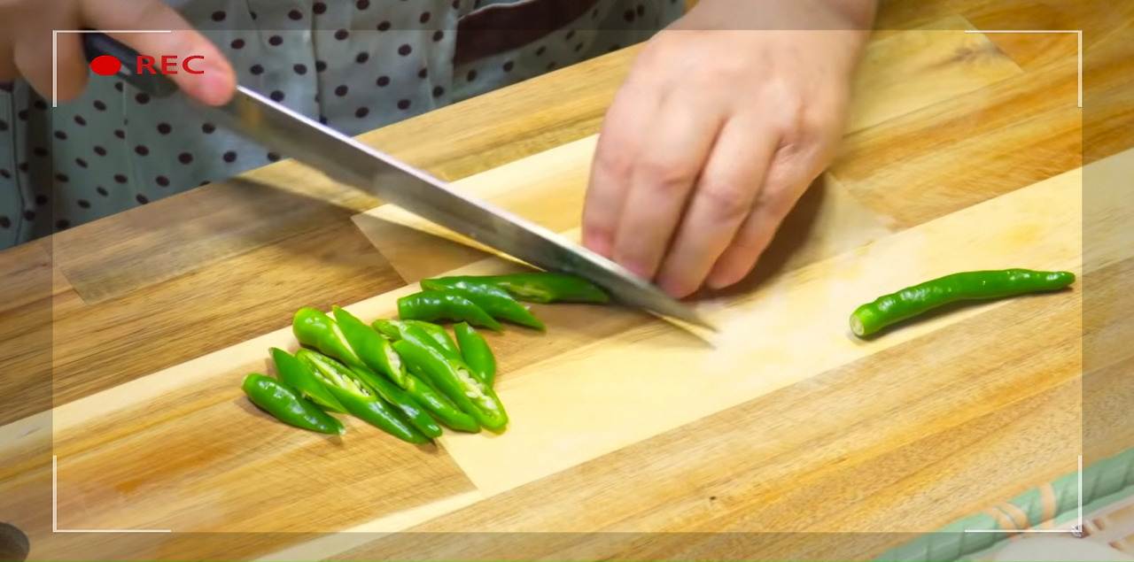 청양고추도 어슷썰기해 주자. 코다리조림이 한층 더 칼칼하고 깔끔해진다.