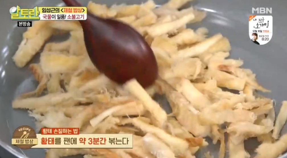 그리고 프라이팬에 황태를 약 3분간 볶아주세요.