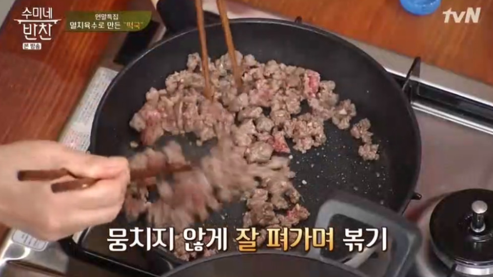 기름을 두르지 않은 프라이팬에 양념을 한 소고기를 넣고 중불에 뭉치지 않게 잘 펴가며 볶아주세요.
