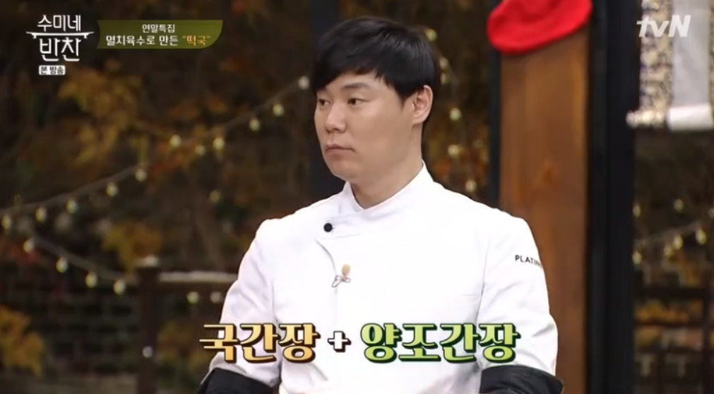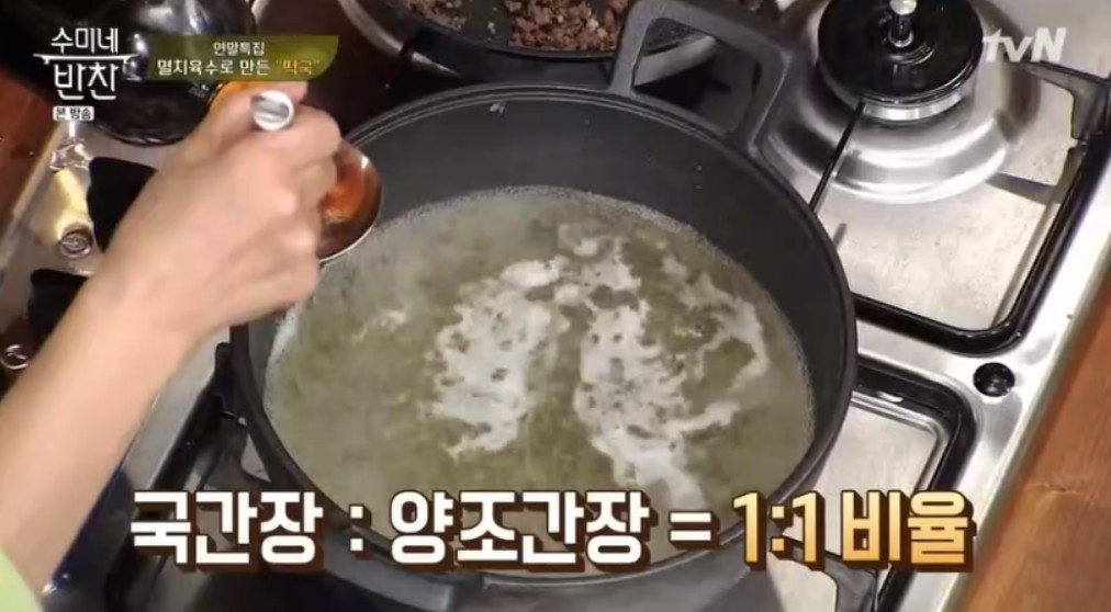 이제 육수에 간을 하시면 돼요. 국간장과 양조간장을 1:1 비율로 1큰술씩 넣어주세요.