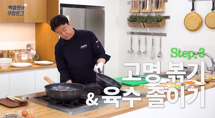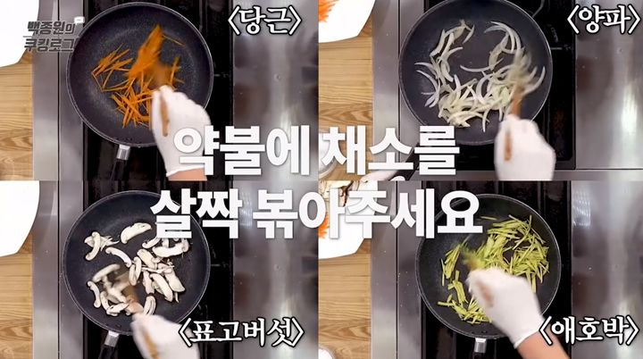 10. 열 번째로, 프라이팬에 썰어둔 채소들을 각각 볶아주세요. 이때 육수를 확인하면서 줄어든 만큼 물을 추가로 보충해줍니다.