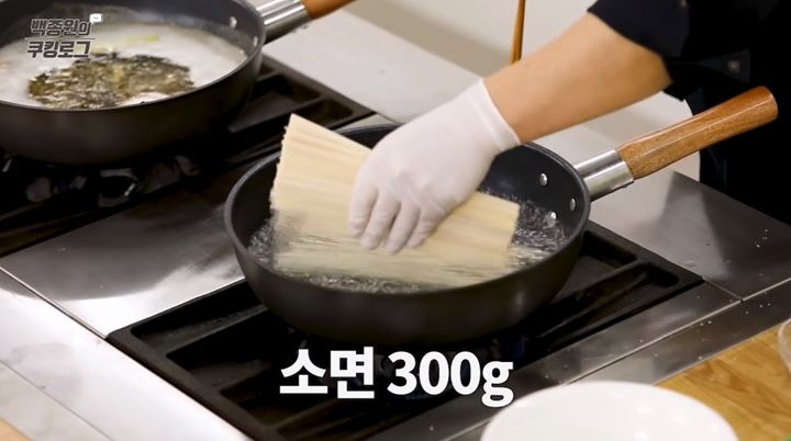11. 열한 번째로, 국수를 삶을 차례입니다. 먼저 소면을 삶을 물을 따로 끓인 뒤, 소면 300g을 넣어주세요. 오늘 알려드리는 양은 3인분 기준입니다.