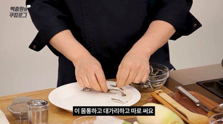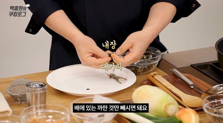 1. 먼저, 잔치국수를 맛있게 만들기 위해 가장 중요한 육수부터 준비해보겠습니다. 멸치를 준비한 뒤에는 내장을 제거해 주세요.