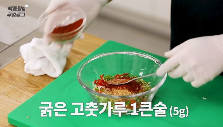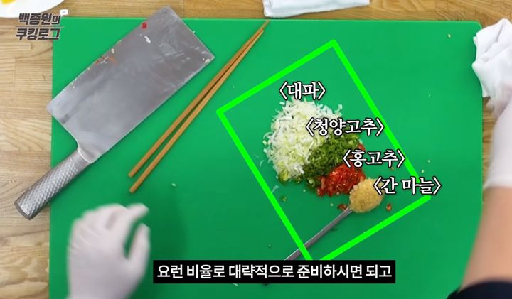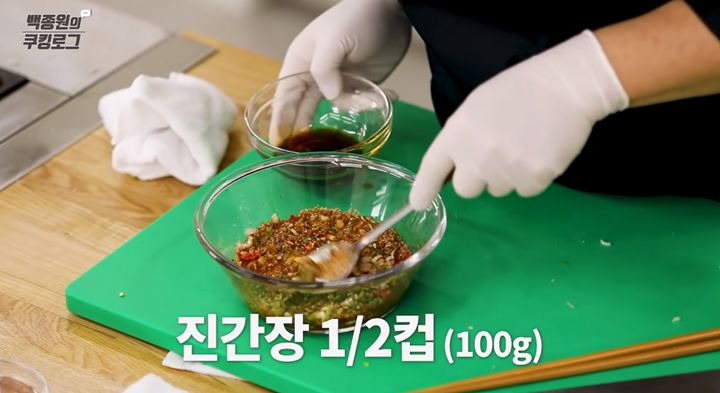 양념장 재료 : 청양고추 1개(12g), 홍고추 1개(15g), 대파 1대(50g), 정수물 1큰술(10g), 간마늘 1큰술(15g), 굵은고춧가루 1큰술(5g), 황설탕 1/3큰술(3g), 깨소금 3큰술(30g), 진간장 1/2컵(100g), 참기름 2큰술(15g), MSG 적당량