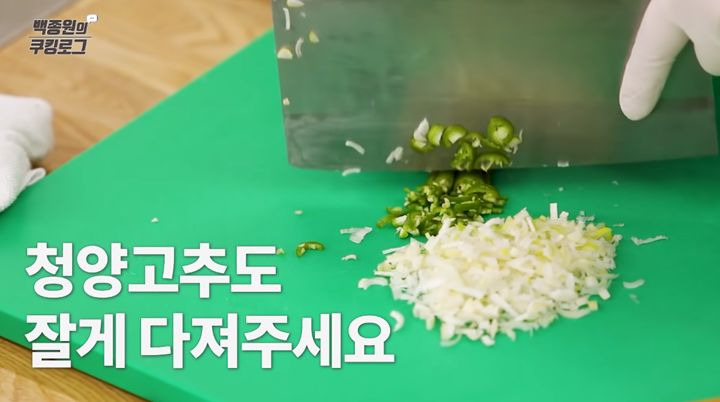 7. 일곱 번째로, 청양고추 1개와 홍고추 1개는 반으로 갈라 잘게 썰고, 간 마늘 1스푼도 준비해 주세요.
