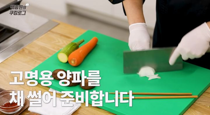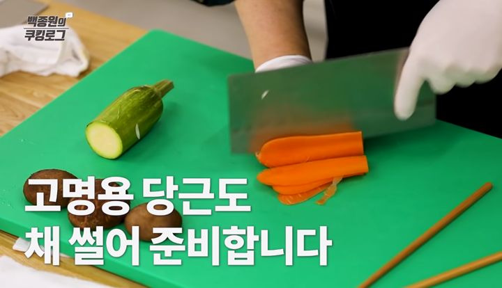 9. 아홉 번째로, 고명을 준비할 차례입니다. 양파, 애호박, 당근, 표고버섯은 곱게 채 썰어 주세요.