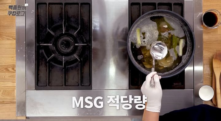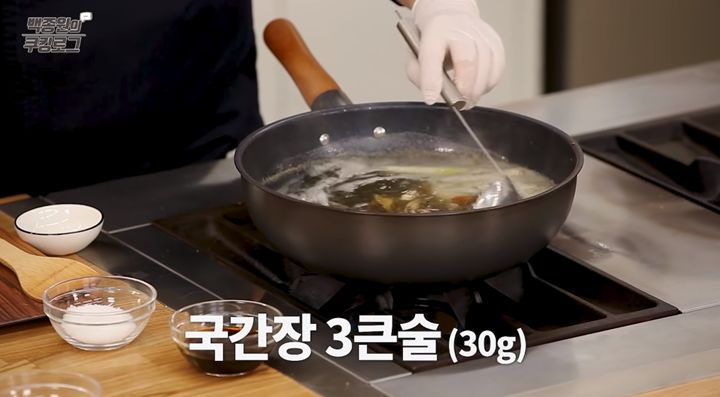 14. 마지막으로, 육수의 간을 확인한 뒤 국간장 3큰술 정도를 넣어 색과 향을 더해주세요.