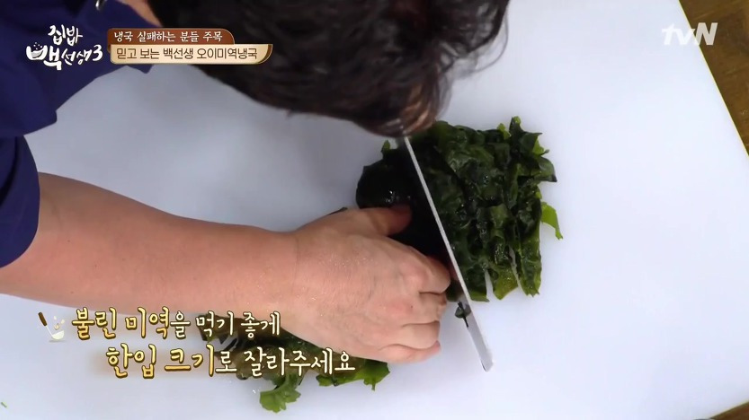 1. 오늘 소개할 오이냉국 황금레시피는 정확히 말하면 오이 미역 냉국에 가까운 레시피입니다. 먼저 미역을 준비해 주세요. 미역은 미리 불린 후 먹기 좋은 크기로 한 입씩 잘라주시면 됩니다.
