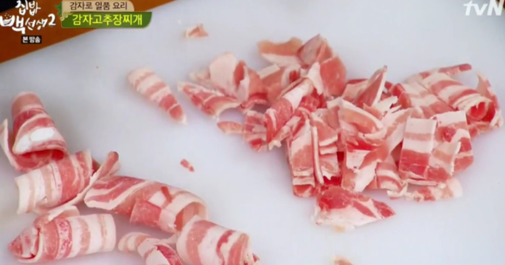 먼저 재료를 손질해 볼까요? 오늘 만들 고추장찌개는 감자 고추장찌개예요. 감자는 한 입 크기로 알맞게 잘라 주세요.