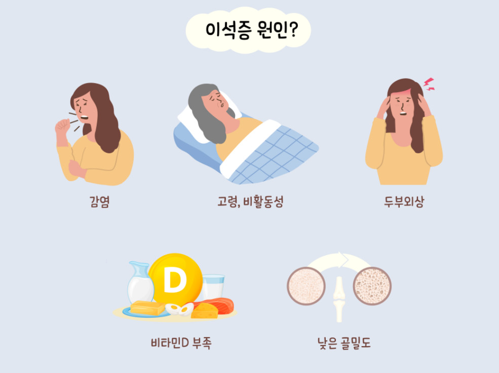 아직 이석증의 정확한 원인은 완전히 밝혀지지 않았지만, 알려진 원인으로는 머리 외상, 장시간 누워 있는 자세, 귀 안의 염증 등이 있습니다. 특히 머리에 외상이 있을 경우 이석기관에서 이석이 떨어져 반고리관으로 들어가는 경우가 많고, 병원에서 수술을 받거나 장시간 누워 있게 되면 이석증이 잘 발생할 수 있습니다.