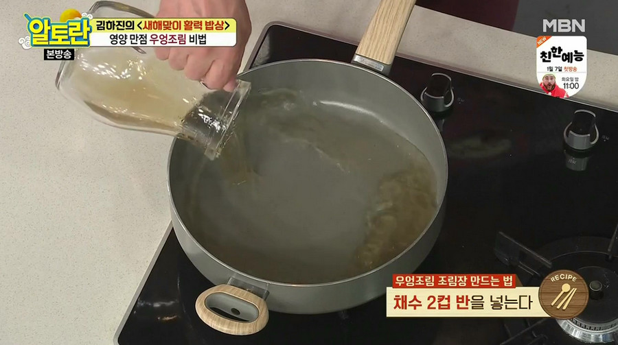 냄비에 물 10컵(2L)을 붓고 센 불에서 끓이다가, 물이 끓어오르면 준비한 육수팩을 넣어 주세요. 센 불에서 약 40분 정도 끓이면 물이 반 이상 줄어드는데, 이때 육수팩을 건져내면 채수가 완성됩니다. 이렇게 만든 채수를 우엉조림에 사용하면 맛과 풍미가 한층 살아난다고 해요.
