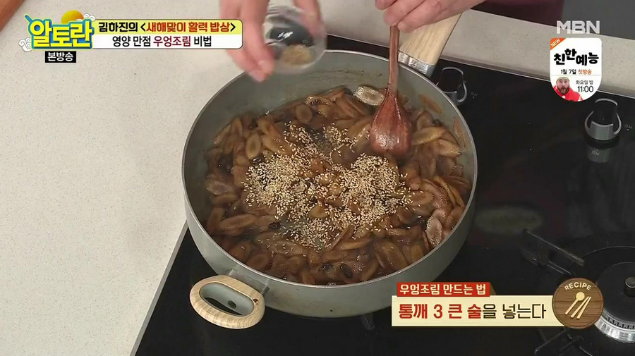 불을 끄고 통깨 3큰술을 넣으면 맛있는 우엉조림이 완성됩니다.