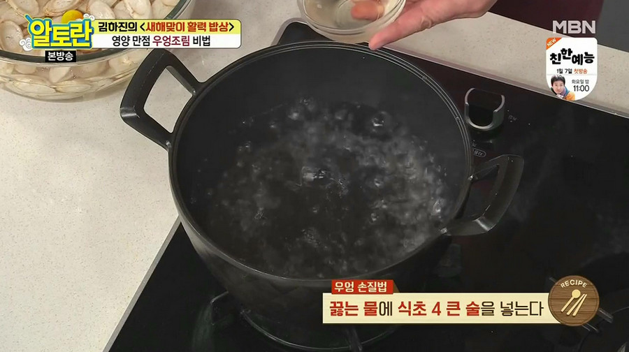 냄비에 물 10컵(2L)을 붓고 센 불에서 끓여 주세요. 물이 끓으면 식초 4큰술을 넣고, 아까 썰어둔 우엉을 넣어 30초간 데쳐 주세요. 이렇게 식초물에 데치면 우엉의 아린 맛이 사라진다고 해요. 데친 우엉은 꺼내 찬물에 헹군 후, 체에 밭쳐 물기를 제거해 주세요.