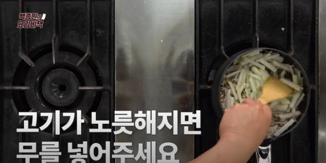 ● 고기가 자글자글 익으면서 기름이 나오기 시작하면, 노릇하게 익을 때까지 구운 뒤 무를 넣어 함께 볶아주세요.