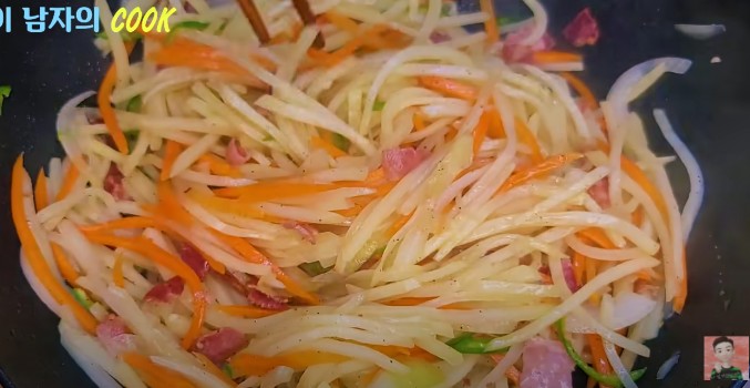 ● 베이컨에서 나온 기름을 다시 가열한 뒤, 감자채, 당근, 양파를 모두 넣고 함께 볶아주세요.