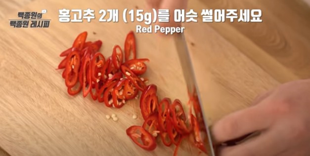 ● 청양고추 3개는 세 등분으로 나누고, 홍고추 2개는 사선으로 얇게 어슷썰어주세요.