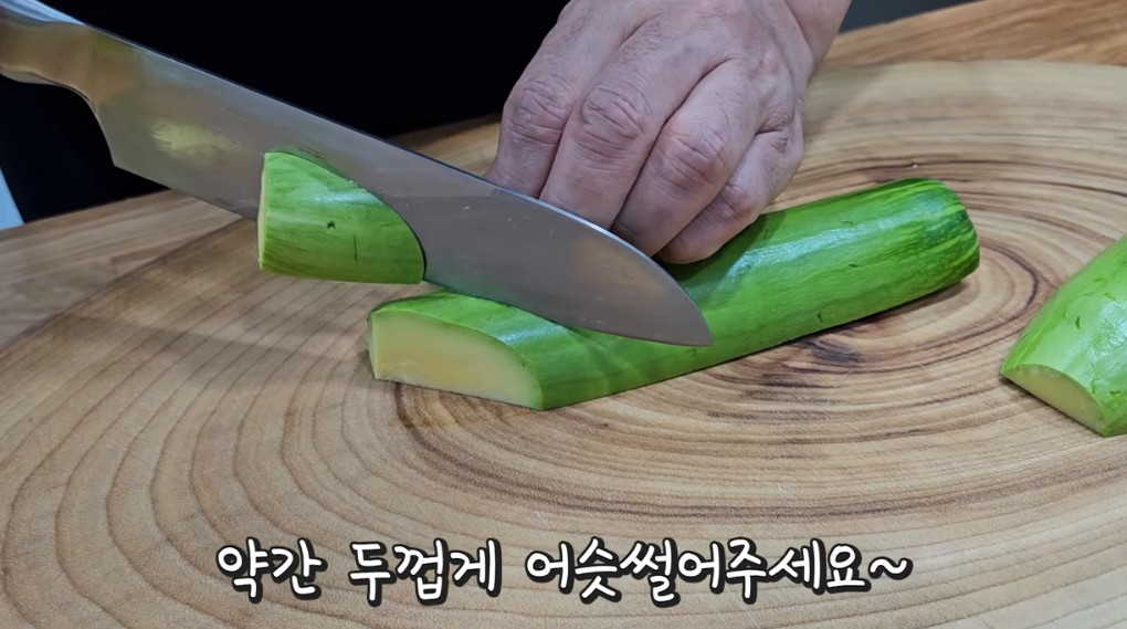 1. 애호박 한 개의 양 끝을 잘라내고 반으로 나눈 뒤, 약간 두툼하게 어슷썰어주세요.