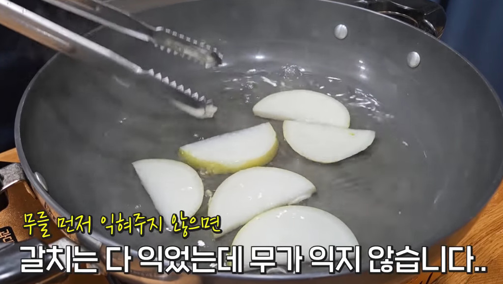 8. 물이 끓기 시작하면 무만 먼저 넣어주세요. 무가 애호박보다 익는 데 시간이 더 걸리기 때문이랍니다.