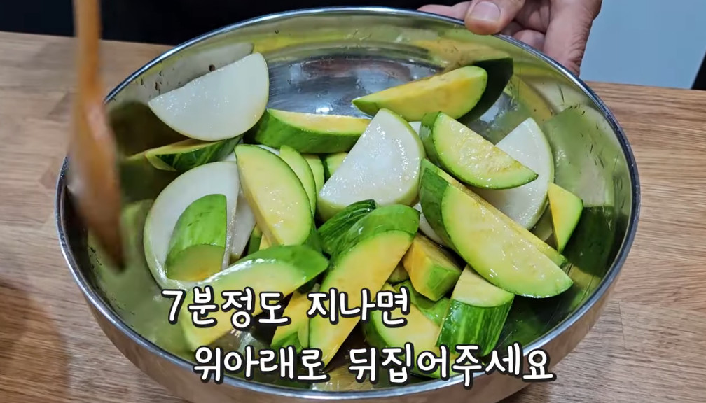 6. 절여놓은 애호박과 무는 약 7분쯤 지나면 위아래로 한 번 뒤집어주세요. 이렇게 해야 더 고르게 절여져요.