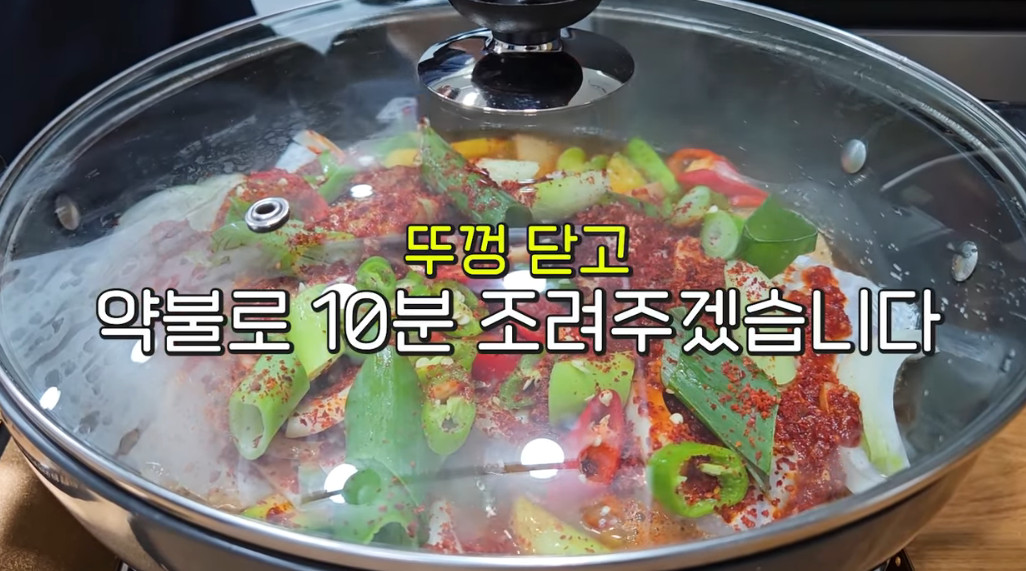16. 냄비 뚜껑을 덮은 채 약한 불에서 은근히 10분 정도 더 졸여주세요.
