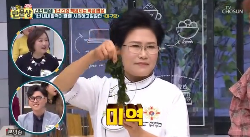 6. 여기서 달인의 비법이 들어가는데요, 바로 시원한 맛을 더해줄 자르지 않은 미역 1줌을 넣는 것입니다. 미역은 10분간 끓인 후 건져내 주세요.
