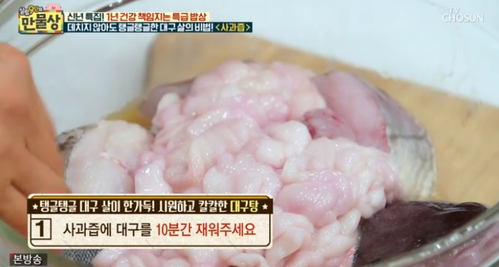 ※ 여기서 달인의 팁을 알려드리자면 대구 살을 탱탱하게 만드는 비법이 바로 사과즙이라고 합니다. 대구 살과 이리를 따로 데치지 않고 사과즙에 재우기만 하면 대구 비린내가 제거되고 살이 탱탱해질 뿐만 아니라 국물 맛이 2배 더 개운하고 맛있어진다고 해요.