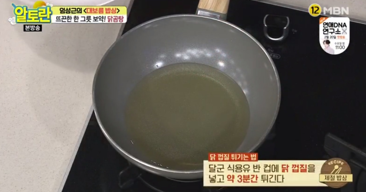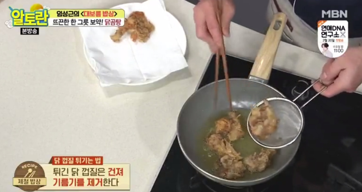22. 여기서 임성근 연구가님의 비법이 들어갑니다. 바로 닭 껍질을 튀기는 건데요, 닭 껍질을 튀겨서 닭곰탕에 넣으면 바삭한 식감과 고소한 맛으로 닭곰탕의 풍미를 더해준다고 해요. 닭 껍질은 반드시 식힌 후 사용해 주세요.