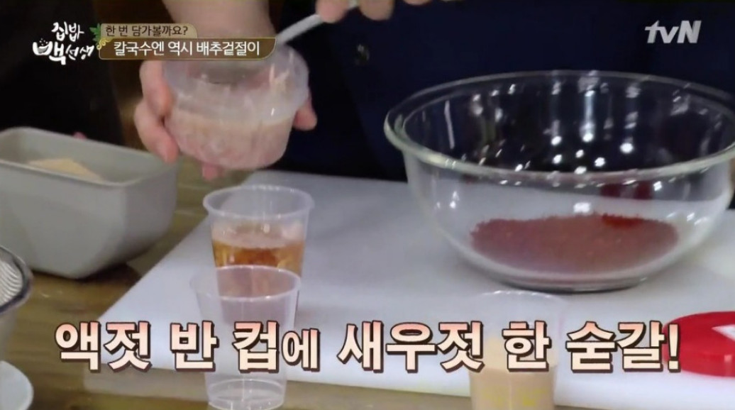 10. 이제 양념을 만들 차례에요. 굵은 고춧가루 1컵, 액젓 반컵, 새우젓 한스푼을 넣어주세요. 하지만, 액젓만 있다면 액젓만 사용하시거나, 새우젓만 있다면 새우젓만 사용하셔도 돼요. 김치에는 새우젓을 사용하는 게 더 맛있다고 하니 참고하시면 좋겠죠?