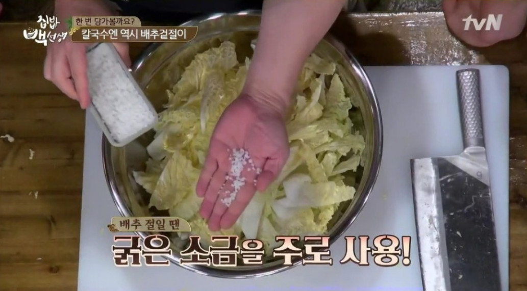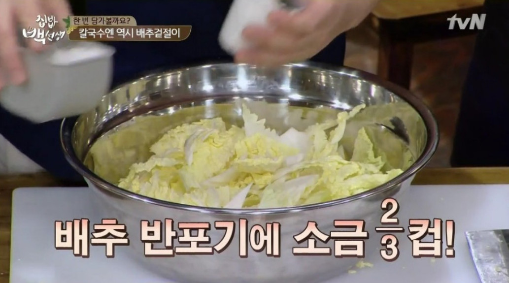 5. 배추를 절일 때는 보통 굵은 소금을 사용하지만, 굵은 소금이 없다면 꽃소금을 대신 사용해도 괜찮아요. 절임에 사용하는 소금의 양은 배추 반 포기 기준으로 종이컵 약 2/3컵 정도면 충분합니다.