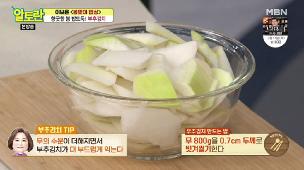 2. 헹군 부추는 체에 밭쳐 물기를 제거해 주세요. 부추김치를 더욱 맛있게 만들기 위해 이보은 셰프는 부추와 함께 무를 추가하는데요, 이는 무가 단맛을 더해주고 수분을 공급해 부추가 더 잘 익혀지도록 도와주기 때문이라고 해요. 무는 800g을 0.7cm 두께로 빗겨 썰어서 준비해 주세요.