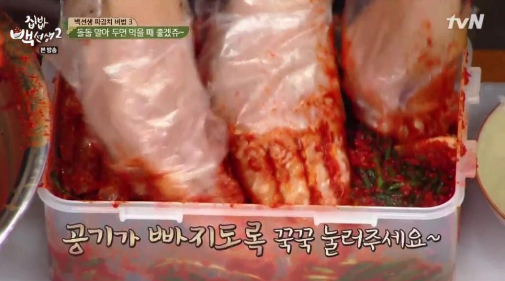10. 파김치를 담을 때는 꼭 꾹꾹 눌러야 해요. 그래야 공기가 최대한 나가고 맛이 깊어진다고 해요. 이렇게 파김치를 통에 담고 나면, 백종원씨가 알려주신 파김치 맛있게 담는 비법의 모든 과정이 완료돼요.