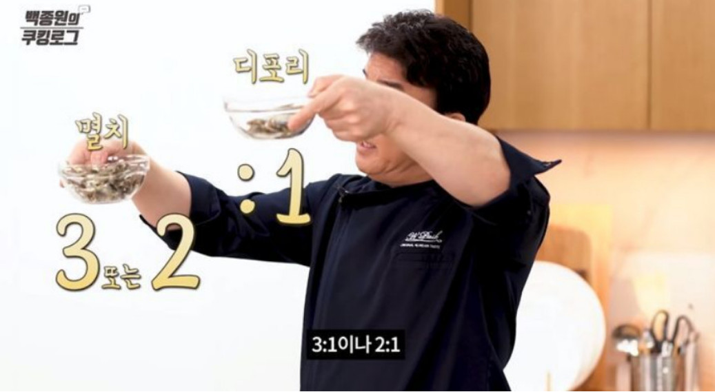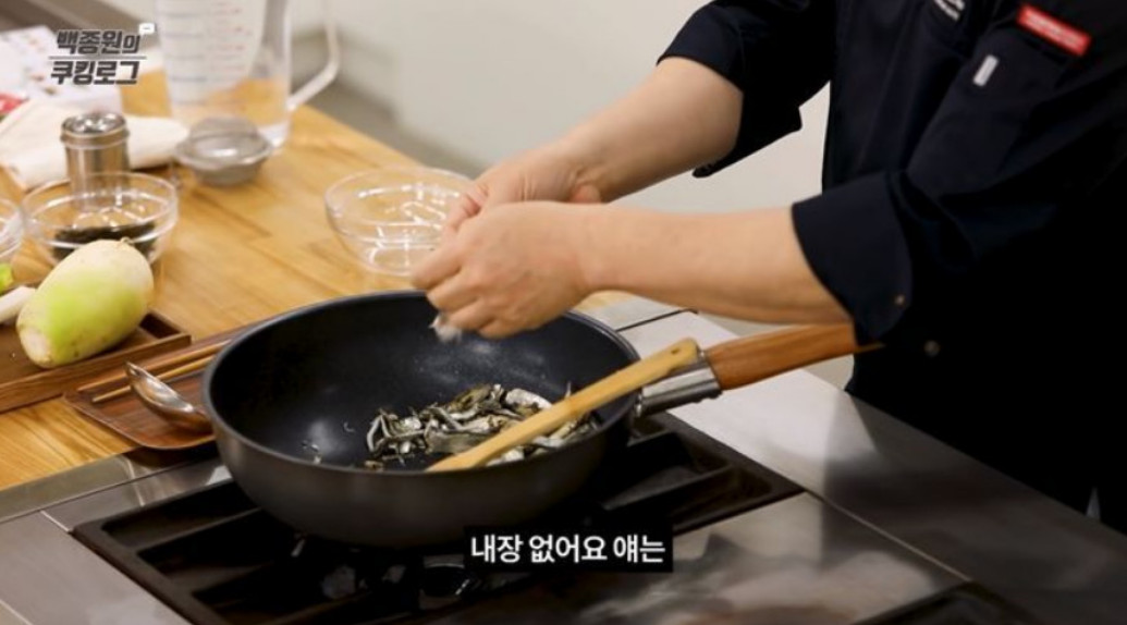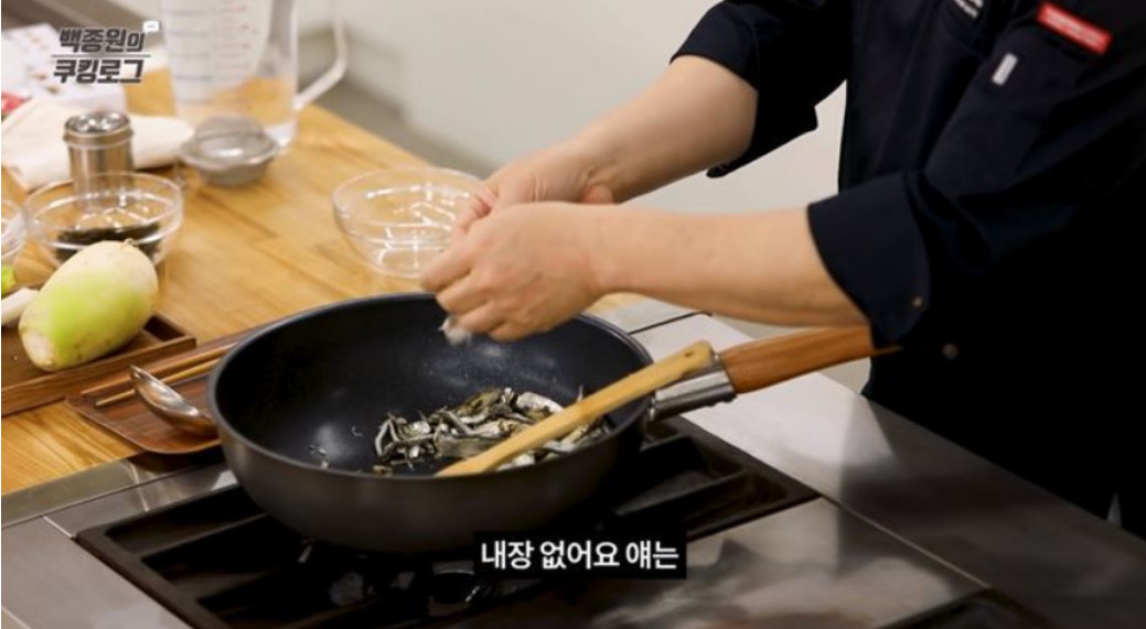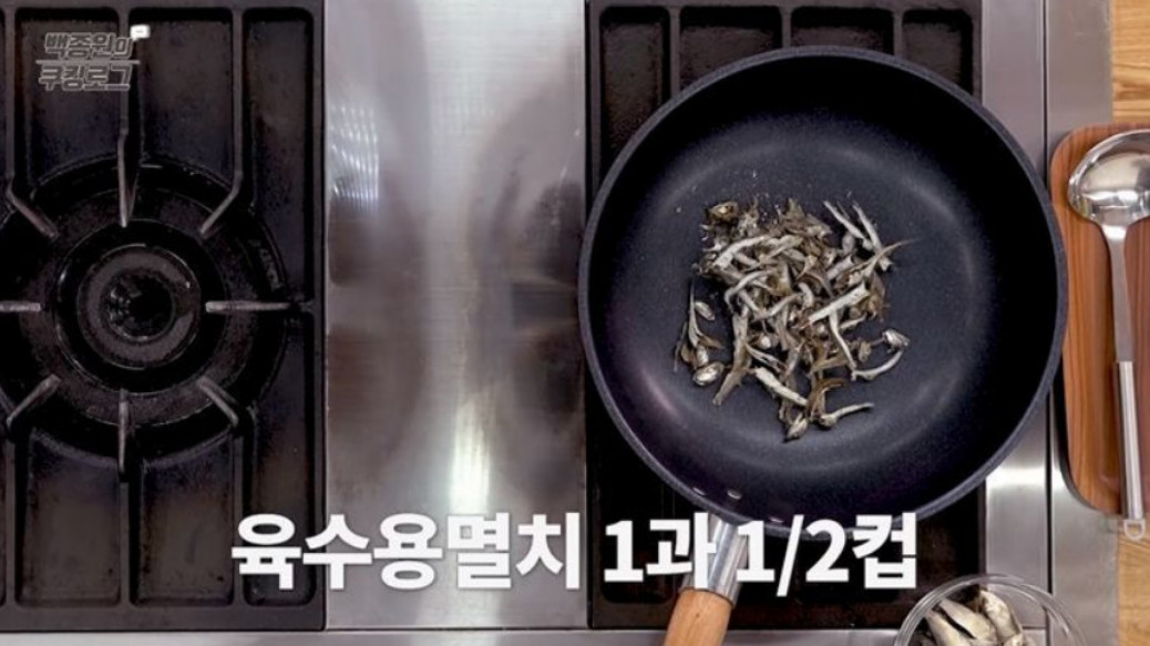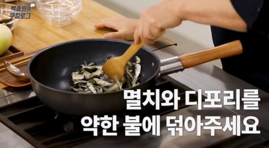 2. 약불로 냄비에 있는 수분을 날려준 후, 멸치와 디포리를 넣고 살짝 볶아주세요. 이렇게 하면 멸치와 디포리의 비린내가 제거되고, 육수가 더 깊은 맛을 낼 수 있어요.