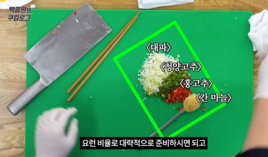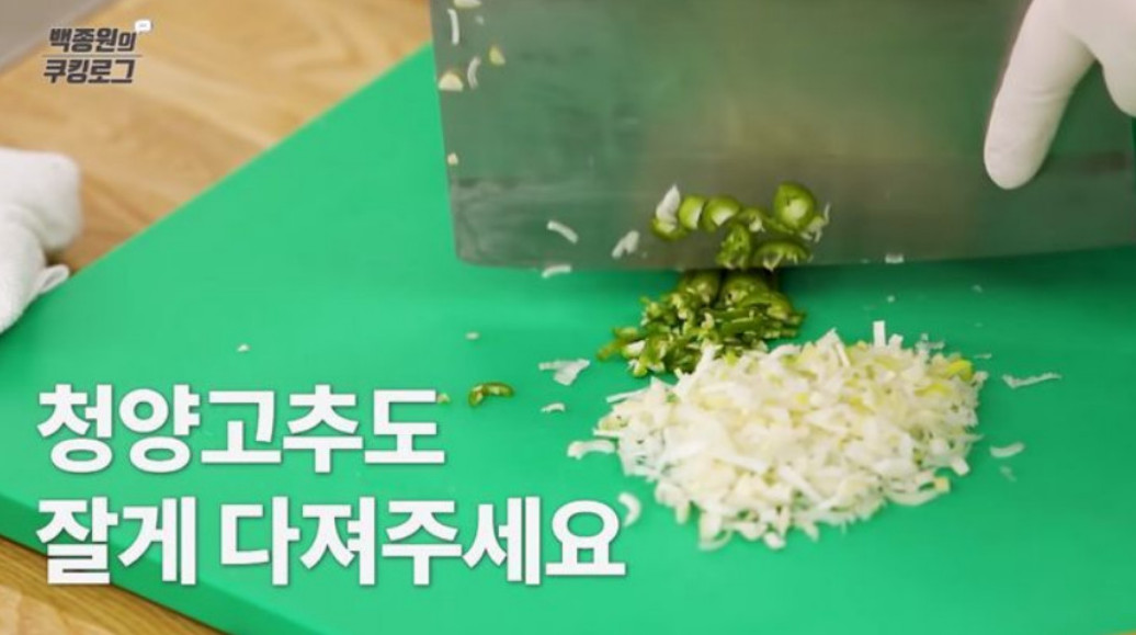 ▶양념장 재료 : 청양고추 1개(12g), 홍고추 1개(15g), 대파 1대(50g), 정수물 1큰술(10g), 간 마늘 1큰술(15g), 굵은 고춧가루 1큰술(5g), 황설탕 1/3큰술(3g), 깨소금 3큰술(30g), 진간장 1/2컵(100g), MSG 적당량, 참기름 2큰술(15g)