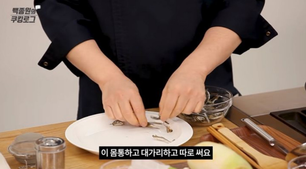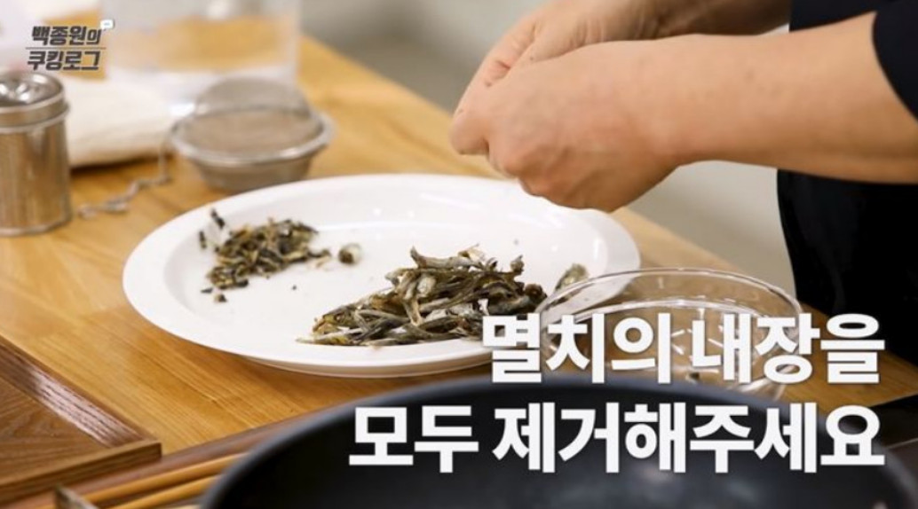 1. 우선 잔치국수의 핵심인 육수부터 만들어야 해요. 준비한 멸치의 내장을 모두 제거해 주세요. 이 과정이 육수의 깔끔한 맛을 위해 중요합니다.