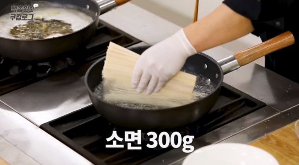 11. 이제 잔치국수를 만들기 위해 모든 재료가 준비되었으니, 본격적으로 면을 삶는 단계에요. 물을 끓여서 소면 300g을 넣어주세요. 오늘 준비한 재료는 3인분을 기준으로 하였어요.