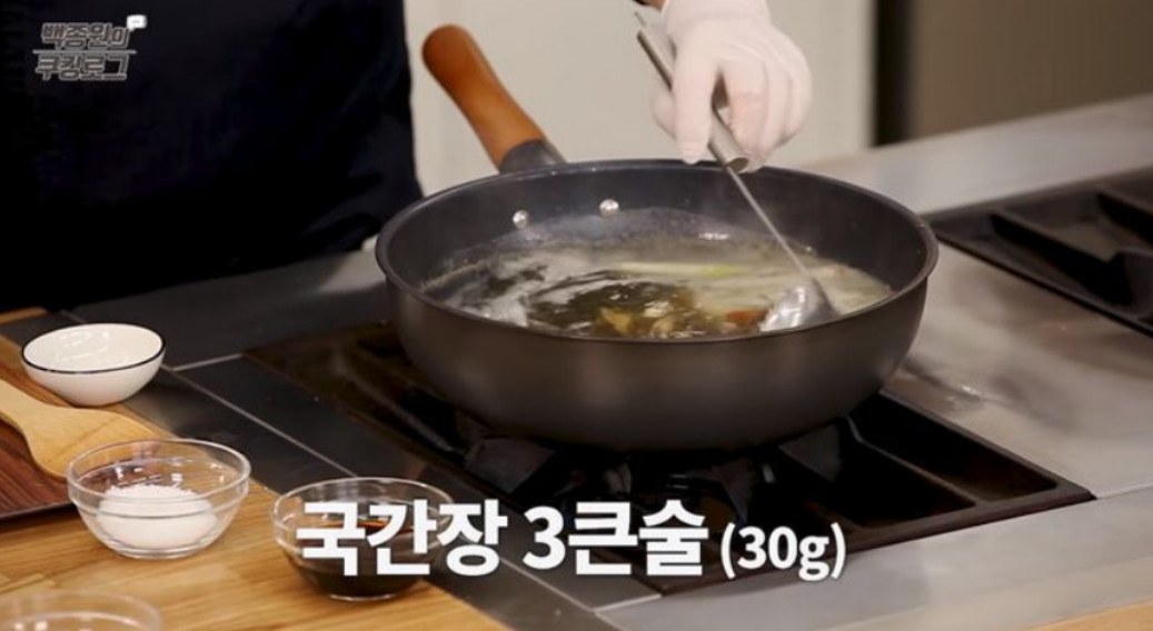 14. 마지막으로 육수의 간을 맞춰주세요. 그리고 국간장 3큰술을 넣어서 색과 향을 내주세요.