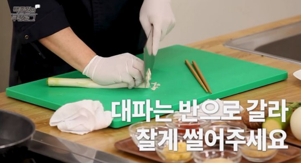 6. 육수를 한 시간 동안 끓이면서 그동안 양념장과 고명을 만들어 줄게요. 먼저 대파를 반으로 갈라 잘게 썰어주세요. 잘게 다진 대파는 나중에 양념장이나 고명에 넣어 향을 내는 데 사용될 거예요.