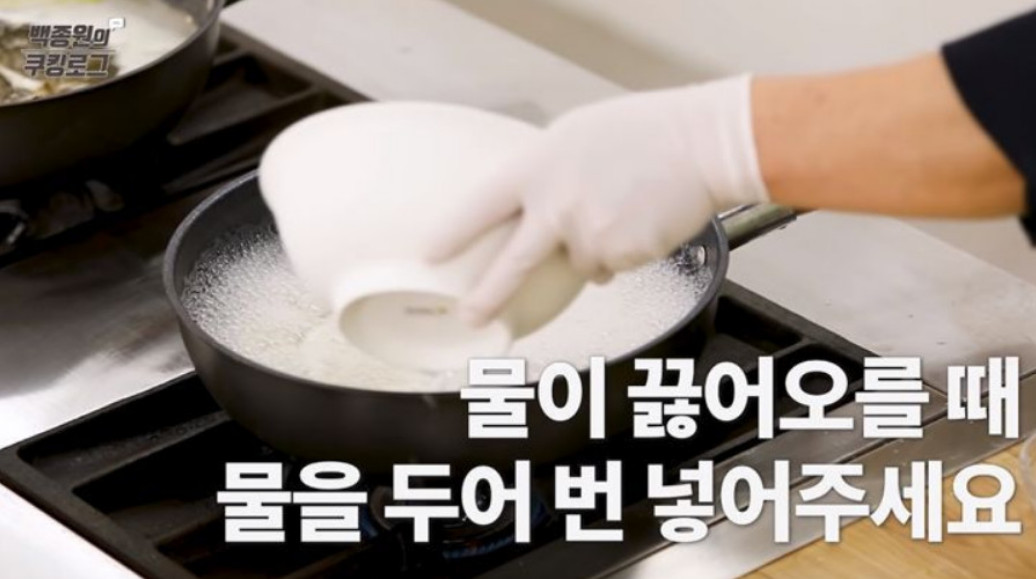 12. 소면을 넣고 물이 팔팔 끓어오르면 찬물을 두 번 부어주세요.