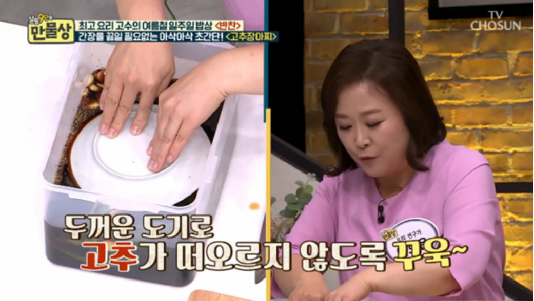 7. 간장물을 만들었으면 고추가 담긴 통에 부어주세요. 그런 다음, 두꺼운 도기로 고추가 떠오르지 않도록 꾸욱 눌러 주세요. 이렇게 하면 고추가 간장물에 잘 잠겨서 맛있게 절여질 거예요.